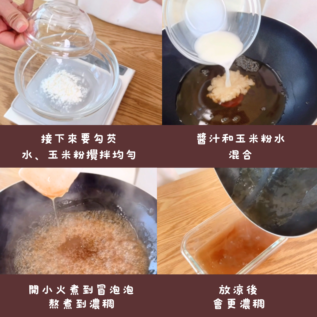 ''先把火關掉再加澱粉水,攪拌均勻再開火,以免結塊''