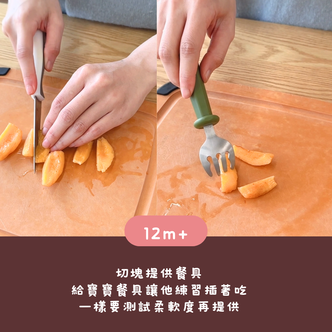 讓他練習插著吃,也是要測試柔軟度再提供