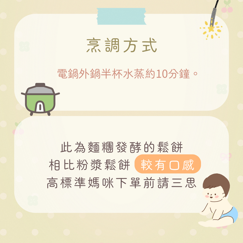 •建議食用年齡►建議8個月以上食用,滿8個月且練習固體食物2個月以上,月份僅供參考,需依照寶寶實際咀嚼能力作調整。