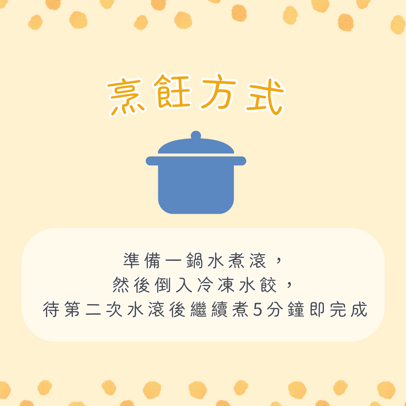 準備一鍋水煮滾,然後倒入冷凍水餃,待第二次水滾後繼續煮5分鐘即完成。