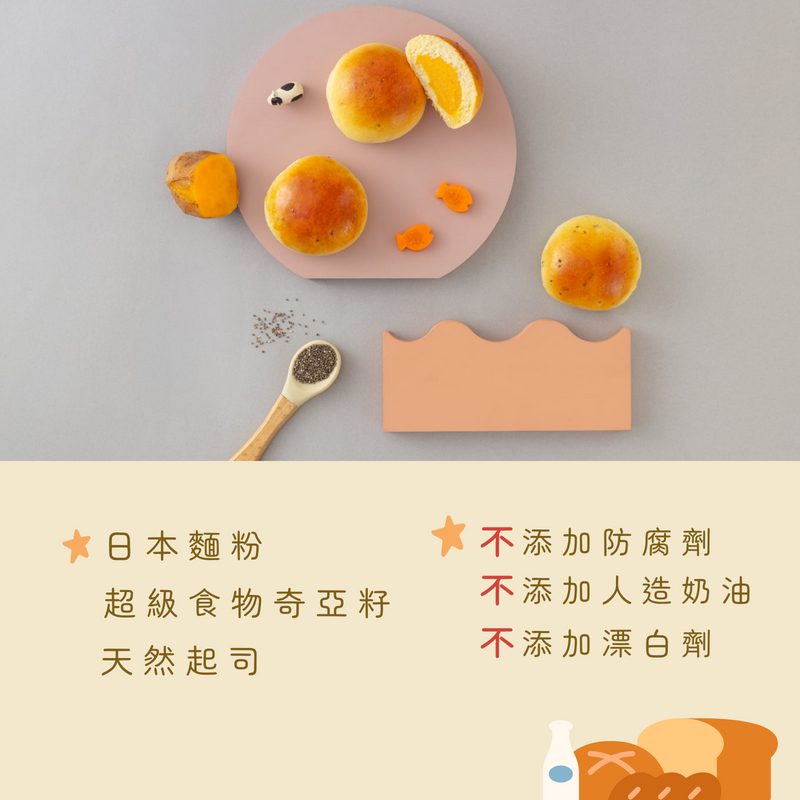 •成分►日本麵粉、地瓜、糖、水、無鹽奶油(乳脂、水、非乳脂固體、乳酸菌)、雞蛋、胡蘿蔔、乳酪(乳脂、牛奶、鹽、乳酸菌)、酵母(天然酵母、水、卵磷脂)、奇亞籽、100%純奶粉、鹽、葵花油