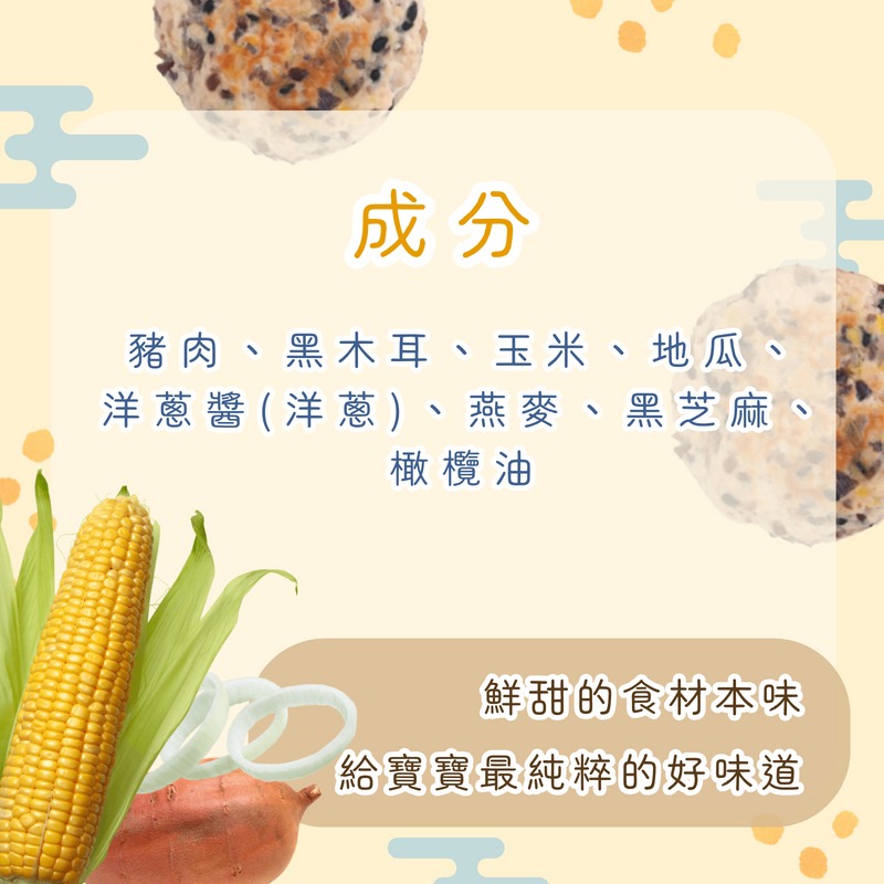 •成分►豬肉、黑木耳、玉米、地瓜、洋蔥醬(洋蔥)、燕麥、黑芝麻、橄欖油