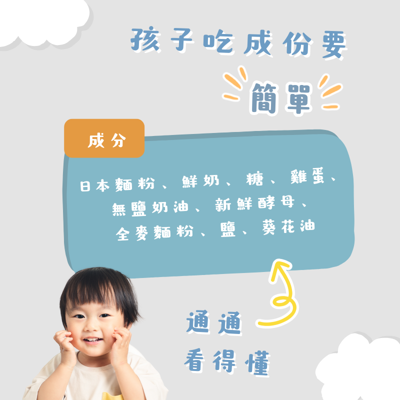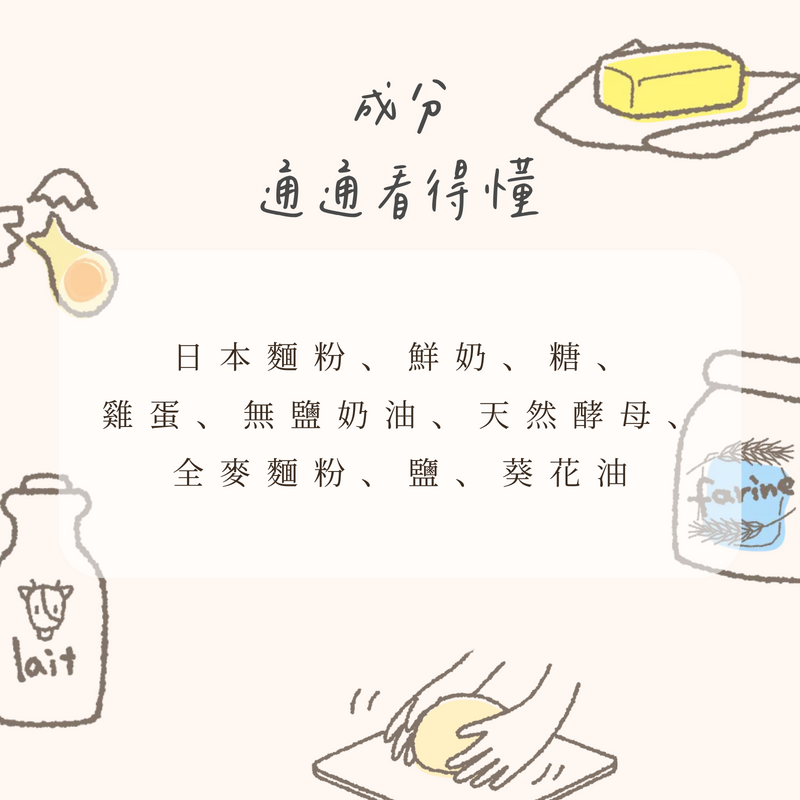 •成分►日本麵粉、鮮奶、糖、雞蛋、無鹽奶油(乳脂、水、非乳脂固體、乳酸菌)、酵母(天然酵母、水、卵磷脂)、全麥麵粉、鹽、葵花油