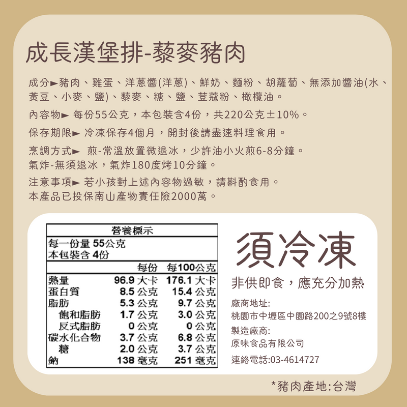 •成分► 豬肉、雞蛋、洋蔥醬(洋蔥)、鮮奶、麵粉、胡蘿蔔、無添加醬油(水、黃豆、小麥、鹽)、藜麥、糖、鹽、荳蔻粉、橄欖油