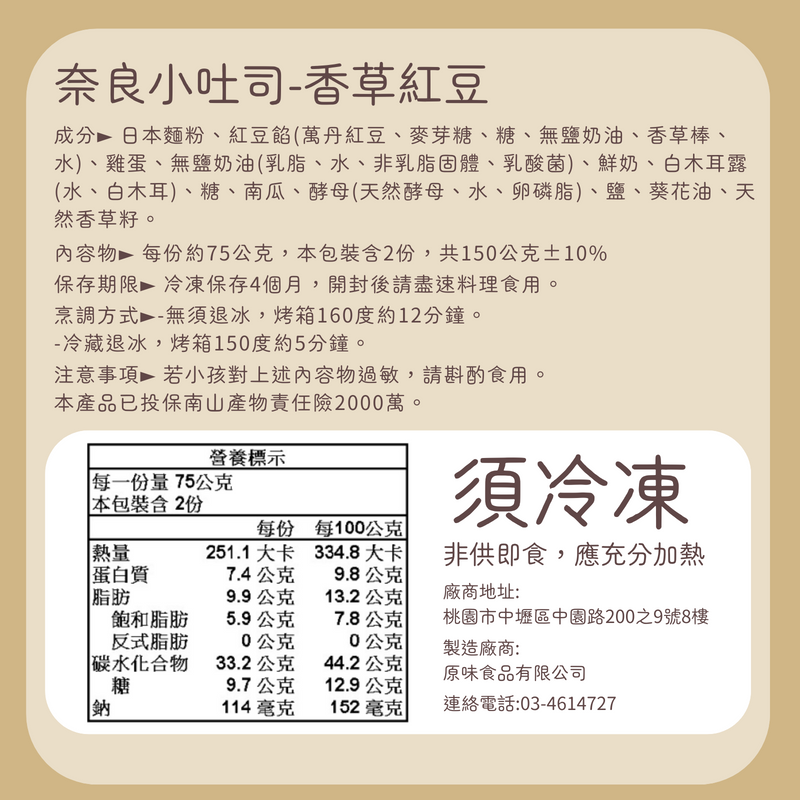 •成分►日本麵粉、紅豆餡(萬丹紅豆、麥芽糖、糖、無鹽奶油、香草棒、水)、雞蛋、無鹽奶油(乳脂、水、非乳脂固體、乳酸菌)、鮮奶、白木耳露(水、白木耳)、糖、南瓜、酵母(天然酵母、水、卵磷脂)、鹽、葵花油、天然香草籽。