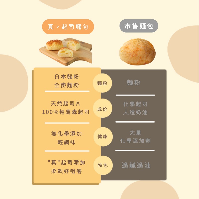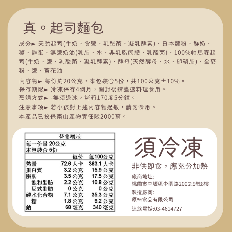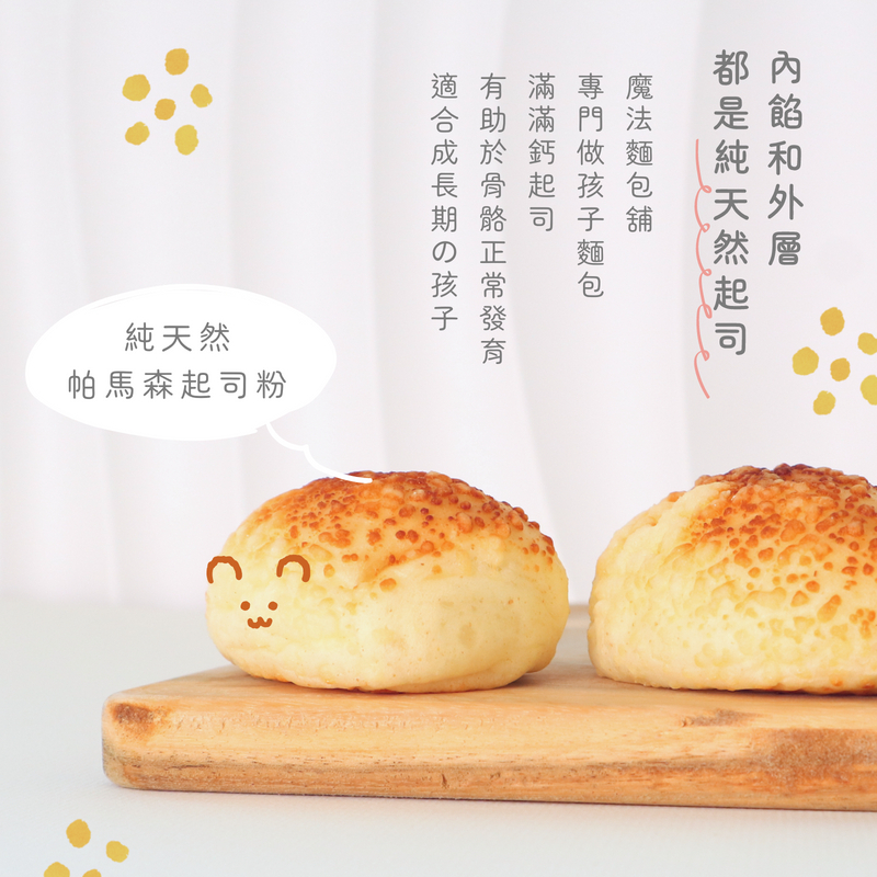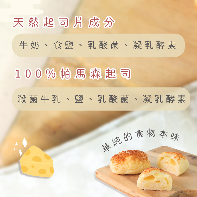 •成分►天然起司(牛奶、食鹽、乳酸菌、凝乳酵素)、日本麵粉、鮮奶、糖、雞蛋、無鹽奶油(乳脂、水、非乳脂固體、乳酸菌)、100%帕馬森起司(牛奶、鹽、乳酸菌、凝乳酵素)、酵母(天然酵母、水、卵磷脂)、全麥粉、鹽、葵花油