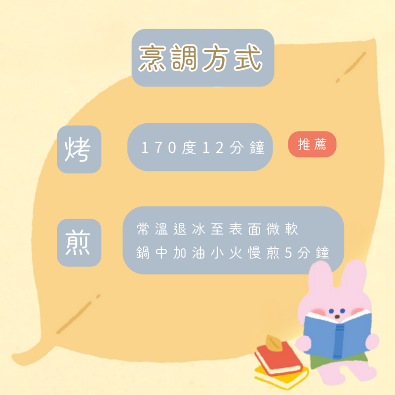 煎-常溫退冰至表面微軟、鍋中加油,小火慢煎5分鐘