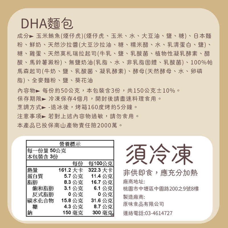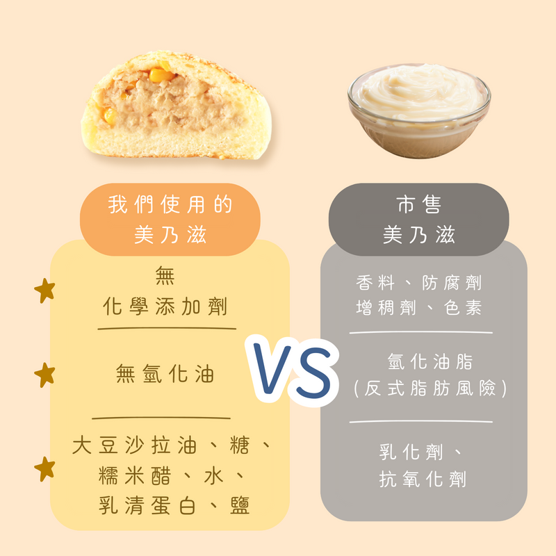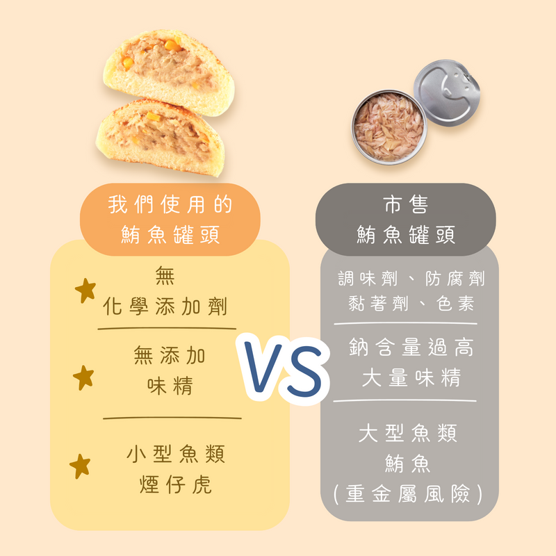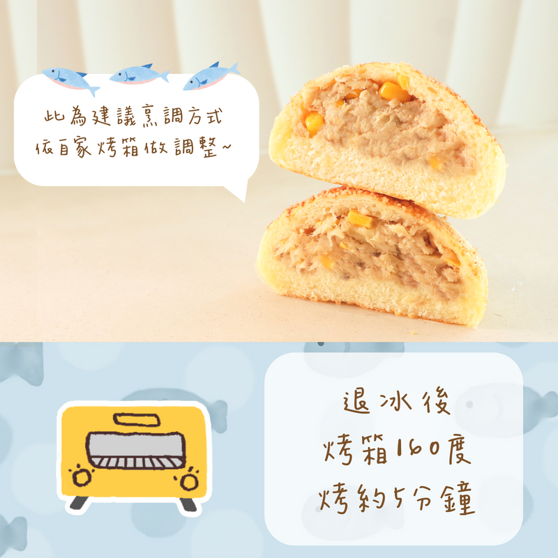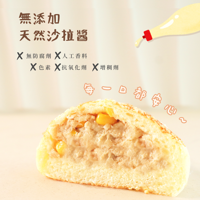 •成分►玉米鮪魚(煙仔虎)(煙仔虎、玉米、水、大豆油、鹽、糖)、日本麵粉、鮮奶、天然沙拉醬(大豆沙拉油、糖、糯米醋、水、乳清蛋白、鹽)、糖、雞蛋、天然莫札瑞拉起司(牛乳、鹽、乳酸菌、植物性凝乳酵素、醋酸、馬鈴薯澱粉)、無鹽奶油(乳脂、水、非乳脂固體、乳酸菌)、100%帕馬森起司(牛奶、鹽、乳酸菌、凝乳酵素)、酵母(天然酵母、水、卵磷脂)、全麥麵粉、鹽、葵花油