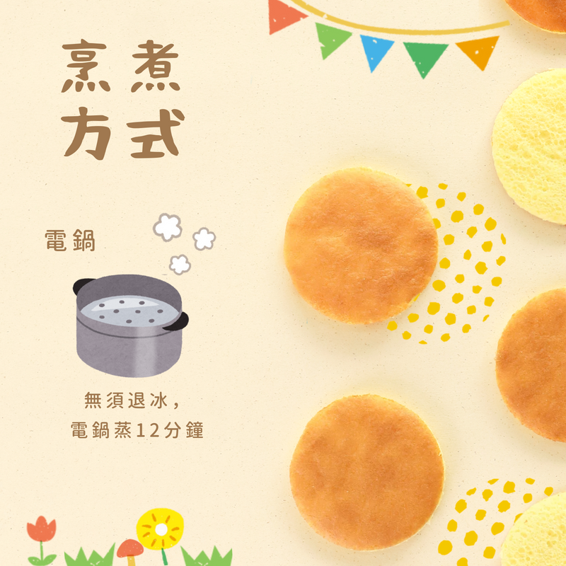 無須退冰,電鍋蒸12分鐘。*請勿用烤箱加熱(配方糖含量極少,烘烤會變硬)*